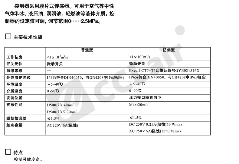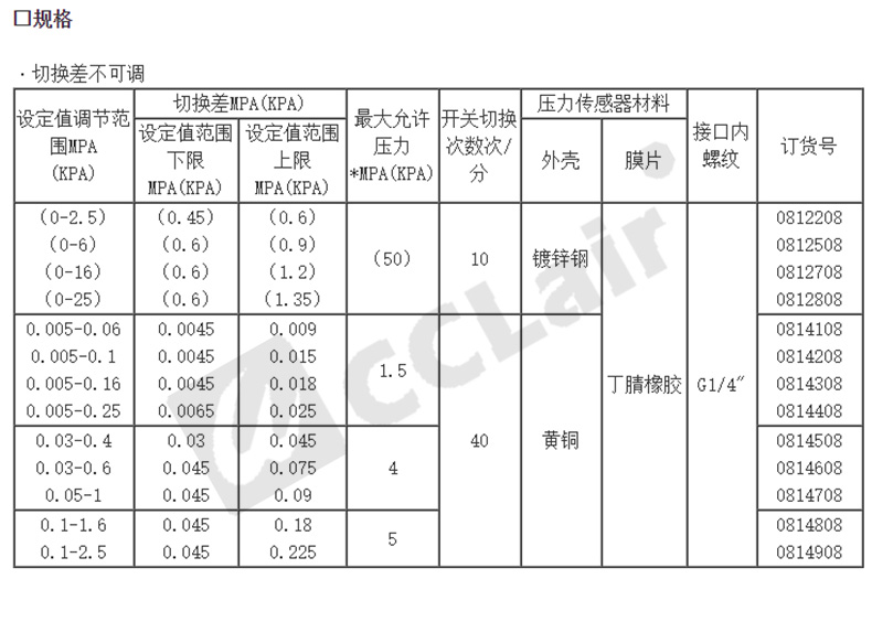 0812208,0814508,0812508,0814608,壓力控制器 D500/7DZ切換差不可調(diào)