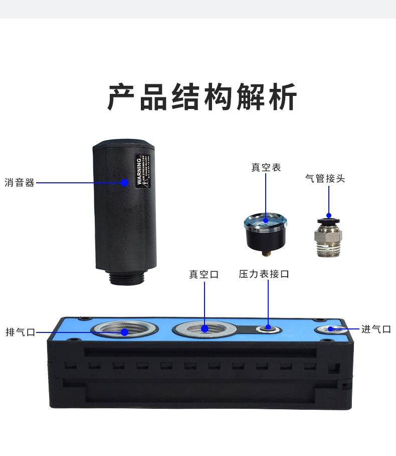 多級高真空型發(fā)生器的工作原理是利用噴管高速噴射壓縮空氣,?在噴管出口形成射流,?產(chǎn)生卷吸流動。?這種工作原理使得噴管出口周圍的空氣不斷地被抽吸走,?從而使吸附腔內(nèi)的壓力降至大氣壓以下,?形成一定真空度。