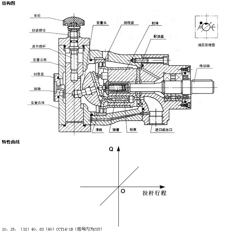 表示:排量為63毫升/轉(zhuǎn),壓力為31.5MPa的手動(dòng)變量的缸體旋轉(zhuǎn)的軸向柱塞油泵。
