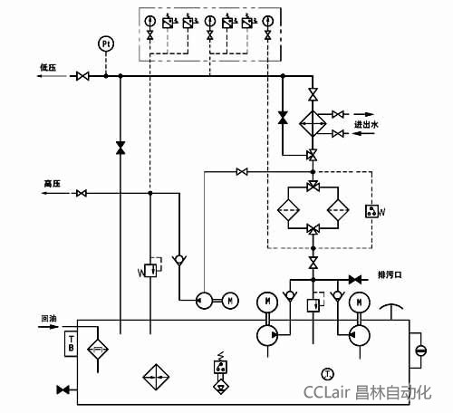 稀油站的高壓部分壓力為31.5MPa,流量為2.5L/min,低壓部分壓力為0.4MPa;流量為16~125L/min,稀油站具有過濾、冷卻、加熱等裝置和聯(lián)鎖、報警、自控等功能。
