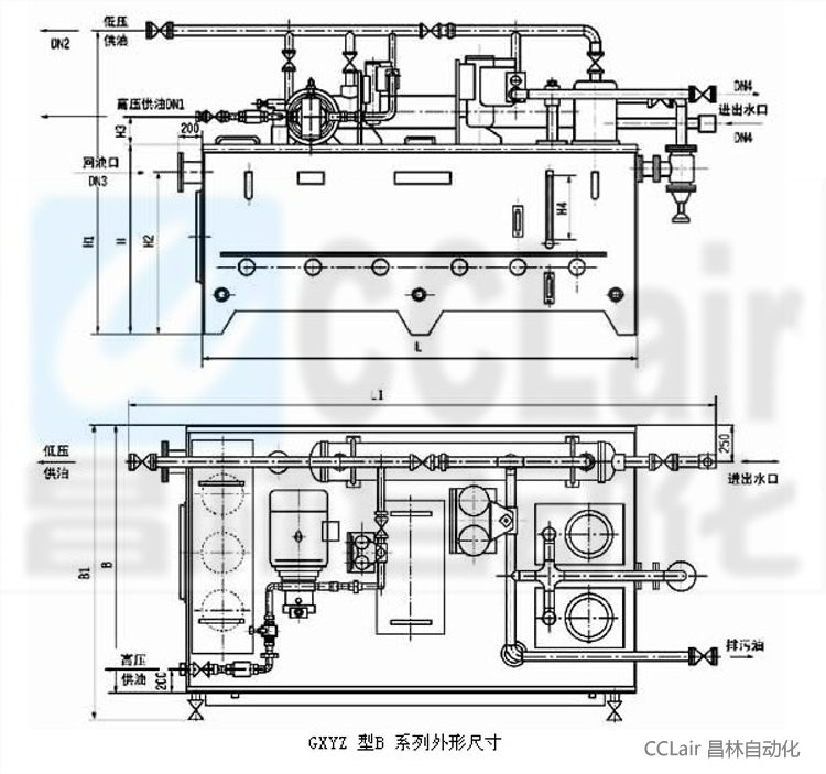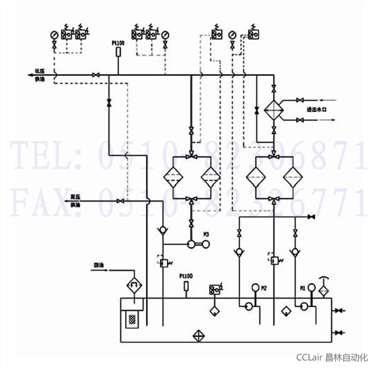 | 本油站為整體式,由油箱、兩臺低壓油泵、一臺高壓油泵、二臺雙筒網(wǎng)片式過濾器、回油磁網(wǎng)過濾裝置、列管式油冷卻器、各種控制閥門、管道以及電接點壓力表、鉑熱電阻等組成。 工作原理基本上也和A系列相同;但B系列的低壓油經(jīng)過過濾和冷卻后外供時,一部分低壓油通過旁路再經(jīng)過一個雙筒過濾器后才進(jìn)入高壓泵的吸油口,以提高高壓油的清潔度等級;但應(yīng)注意當(dāng)?shù)蛪汗┯蛯嶋H壓力較小時(例如小于0.2MPa時),由于后一過濾器同樣也有壓差損失(也隨時間逐步增大),為保證高壓油泵順利吸入,吸入口應(yīng)始終保證正壓(當(dāng)后過濾器切換前壓差達(dá)最大時也必須滿足這一要求);除 流量和A系列有很大不同外,最主要特點(結(jié)構(gòu)特征)為高壓泵吸口前有另一臺過濾器。 其他工作原理和操作控制可參見A系列所述。 |