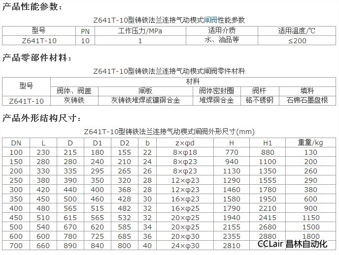Z641T-10 型氣動楔式閘閥:氣動、法蘭連接、明桿楔式剛性單閘板,閥座密封面材料為銅合金,公稱壓力 PN10,閥體材料為灰鑄鐵的閘閥。