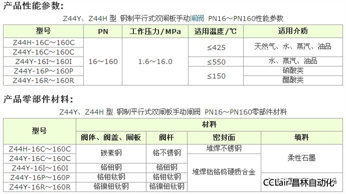Z44H、Z44Y 型 PN16~PN160 鋼制平行式雙閘板閘閥:手動(dòng)、法蘭連接、明桿平行式剛性雙閘板,閥座密封面材料為堆焊不銹鋼(Z44H)、堆焊硬質(zhì)合金(Z44Y),公稱壓力 PN16~PN160,閥體材料為碳素鋼(Z44H-16C~160C Z44Y-16C~160C)、鉻鉬鋼(Z44Y-16I~160I)、不銹鋼(Z44Y-16P~160P Z44Y-16R~160R)的閘閥。
