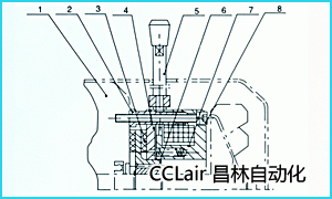 | 5、安裝示意圖 1、電機(jī)端蓋 2、空心螺栓裝置 3、制動盤 4、銜鐵 5、手動釋放裝置 6、花鍵套 7、磁軛組件 8、安裝螺栓 |