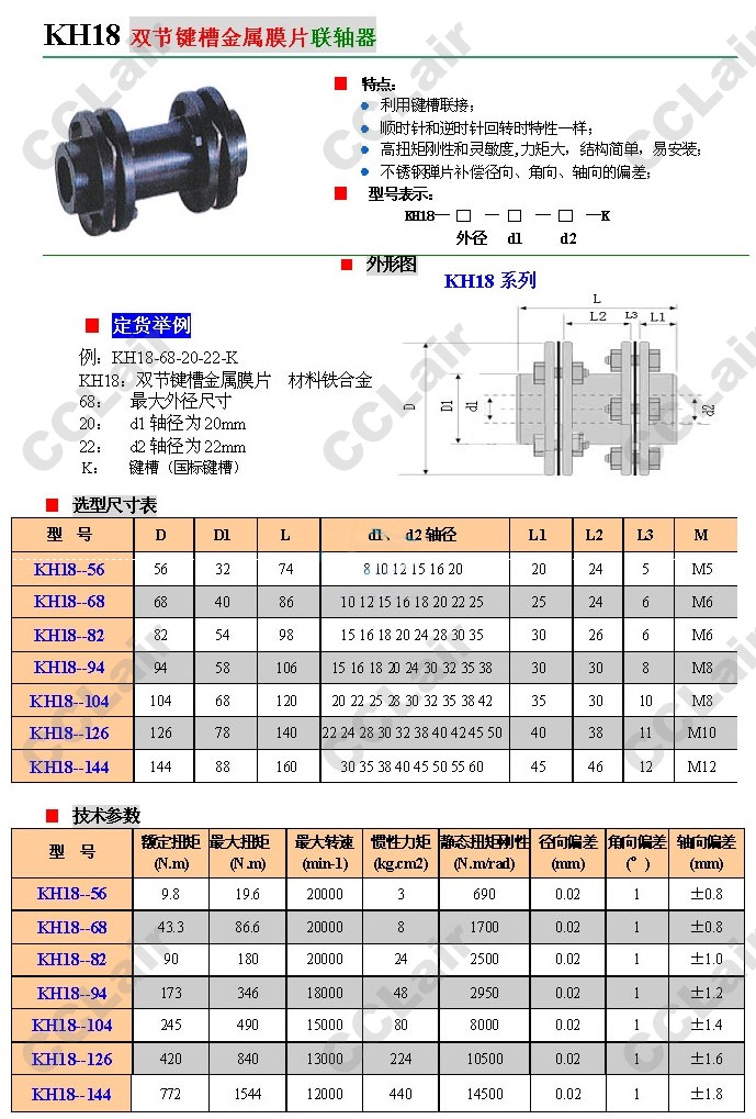 KH18-56,KH18-68,KH18-82,KH18-94,KH18-104,KH18-126,KH18-144,雙節(jié)鍵槽金屬膜片聯(lián)軸器
