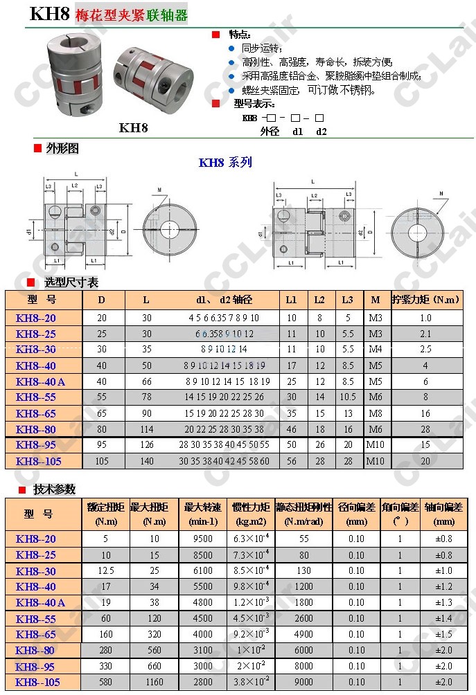 KH8-20,KH8-25,KH8-30,KH8-40,KH8-40A,KH8-55,KH8-65,KH8-80,KH8-95,KH8-105,梅花型夾緊聯(lián)軸器
