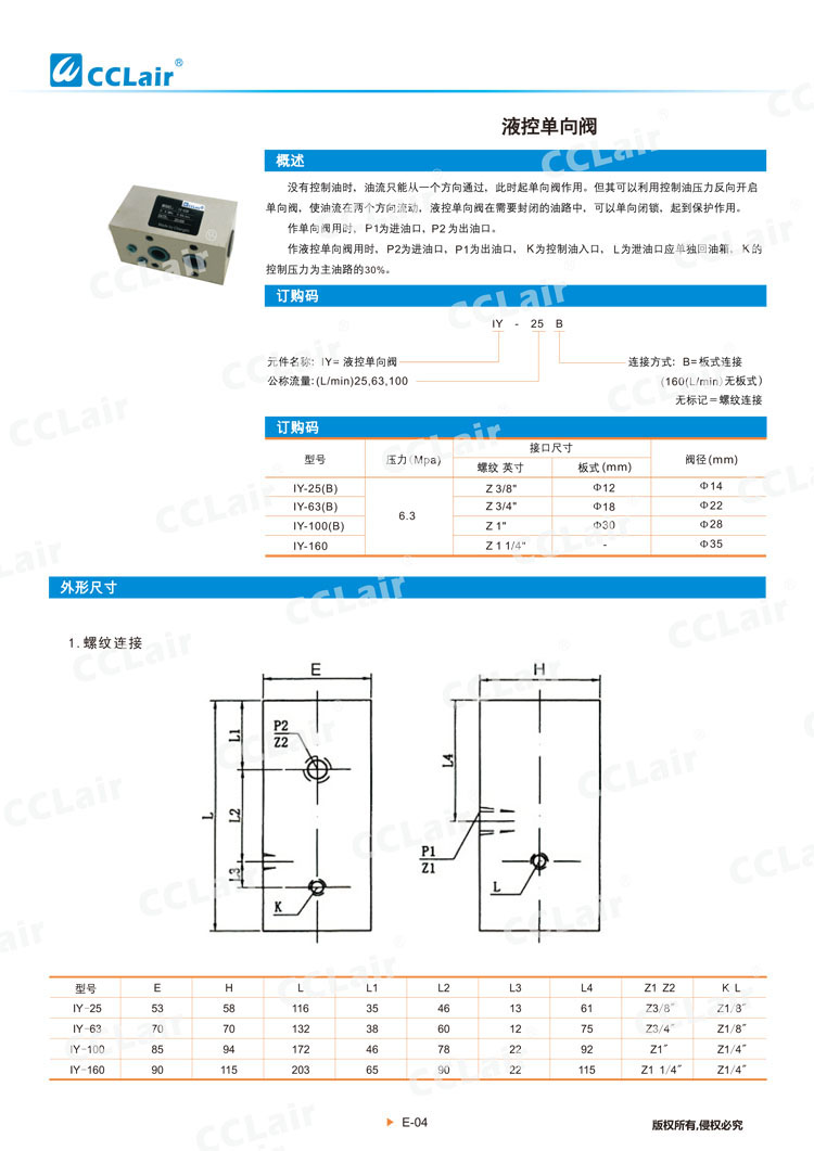 IY-25,IY-63,IY-100,IY-25B,IY-63B,IY-100B,IY-160,液控單向閥