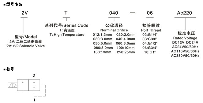 ▲ 欲訂購(gòu)接管螺紋為G1/4",標(biāo)準(zhǔn)電壓為DC24V,公稱通徑為3mm,2VT系列電磁閥,其正確的訂購(gòu)碼為:2VT030-02-DC24V