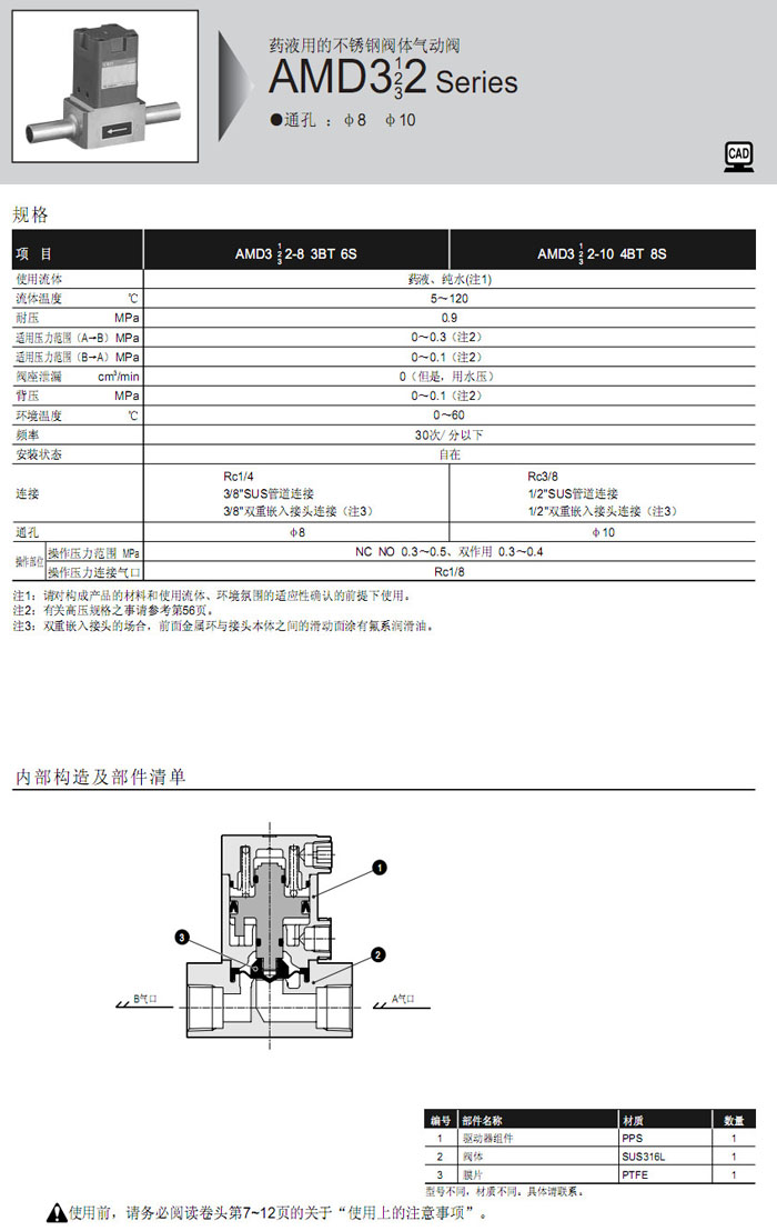 AMD312-8,AMD322-8,AMD332-8,AMD312-10,AMD322-10,AMD332-10,AMD312-3BT,CKD藥液用氣動閥