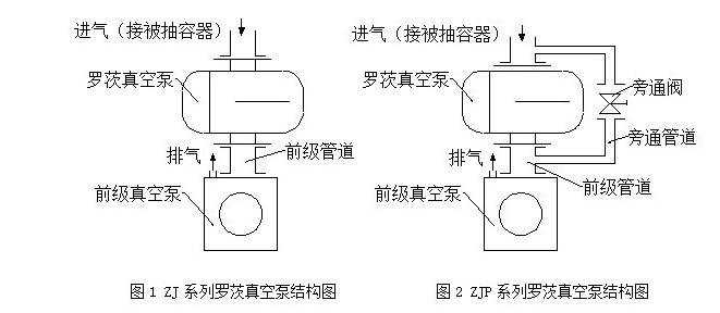 二、ZJ系列羅茨真空泵在較低入口壓力時(shí)具有較高的抽氣速率,但它不能單獨(dú)使用,必須有一臺前級真空泵串聯(lián),待被抽系統(tǒng)中的壓力被前級真空泵抽到羅茨真空泵允許的入口壓力時(shí),羅茨真空泵才開始工作(見圖1)。