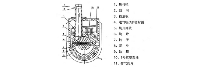 2XZ旋片式真空泵系雙級高速直聯(lián)結(jié)構(gòu)旋片式真空泵。它有偏心地裝在泵腔內(nèi)的轉(zhuǎn)子,及轉(zhuǎn)子槽內(nèi)的旋片。轉(zhuǎn)子帶動旋片轉(zhuǎn)時,旋片緊貼腔壁,把進(jìn)、排氣口分隔開來,并使進(jìn)氣積腔容積周期性地擴大而吸氣,排氣腔容積則周期性地縮小而壓縮氣體,推開排氣閥排氣,從而獲得真空。圖一為單級泵的工作原理示意圖。雙級是兩個單級串聯(lián)而成。