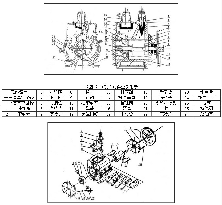 2X旋片式真空泵由泵體、高轉(zhuǎn)子、低轉(zhuǎn)子、前端板、后端板、高轉(zhuǎn)片、低轉(zhuǎn)片、排氣閥、排氣罩、視鏡等零部件組成。見圖2、圖3。
