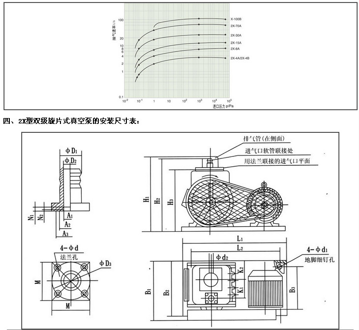 (4)2X旋片式真空泵型號表示方法:列2K—1,2代表雙級泵,K代表旋片式真空泵,一橫線后面的數(shù)字代表每秒鐘的抽速。