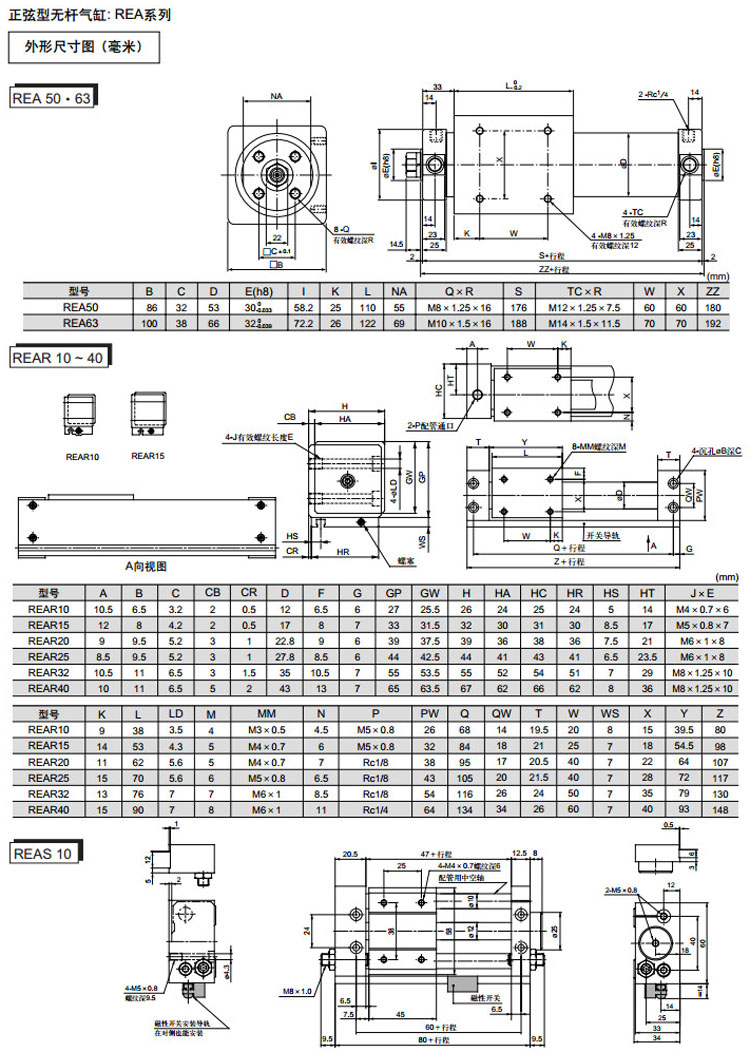 REB25-200,REB32-200,REB40-200,REB50-200,REB63-200,REB25-250,REB32-250,SMC正弦無(wú)桿氣缸