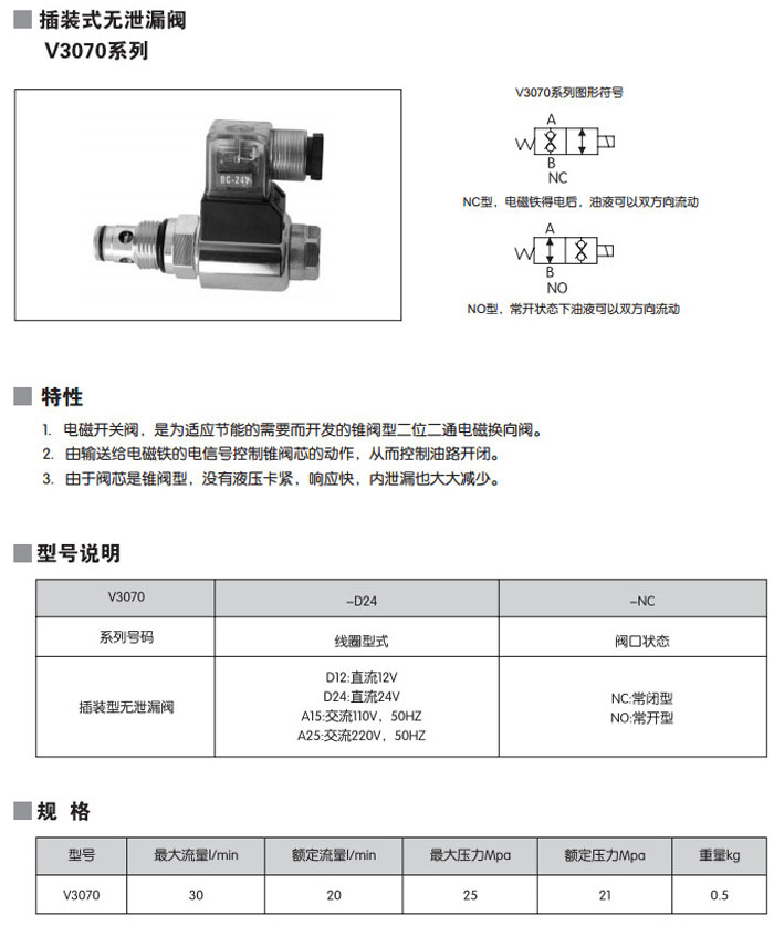 V3070-D24-NC,V3070-A25-NC,V3070-D12-NC,V3070-D12-NO,V3070-A15-NC,V3070-A15-NO,插裝式無泄漏閥