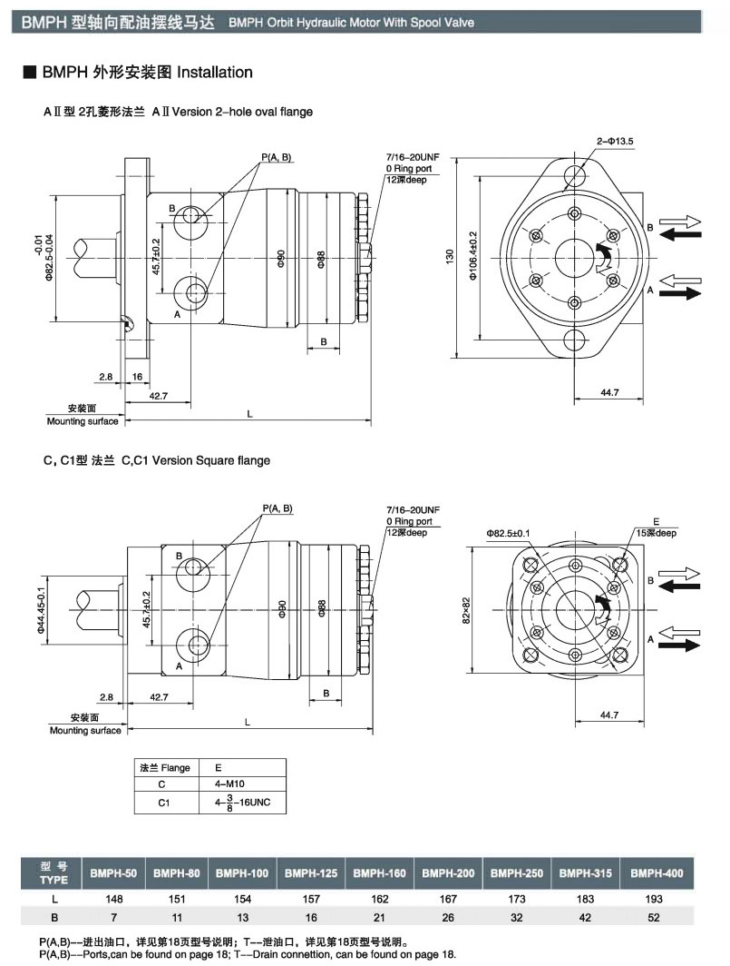 BMPH-50,BMPH-80,BMPH-100,BMPH-125,BMPH-160,BMPH-200,BMPH-250,BMPH-315,BMPH-400,軸向配油擺線馬達