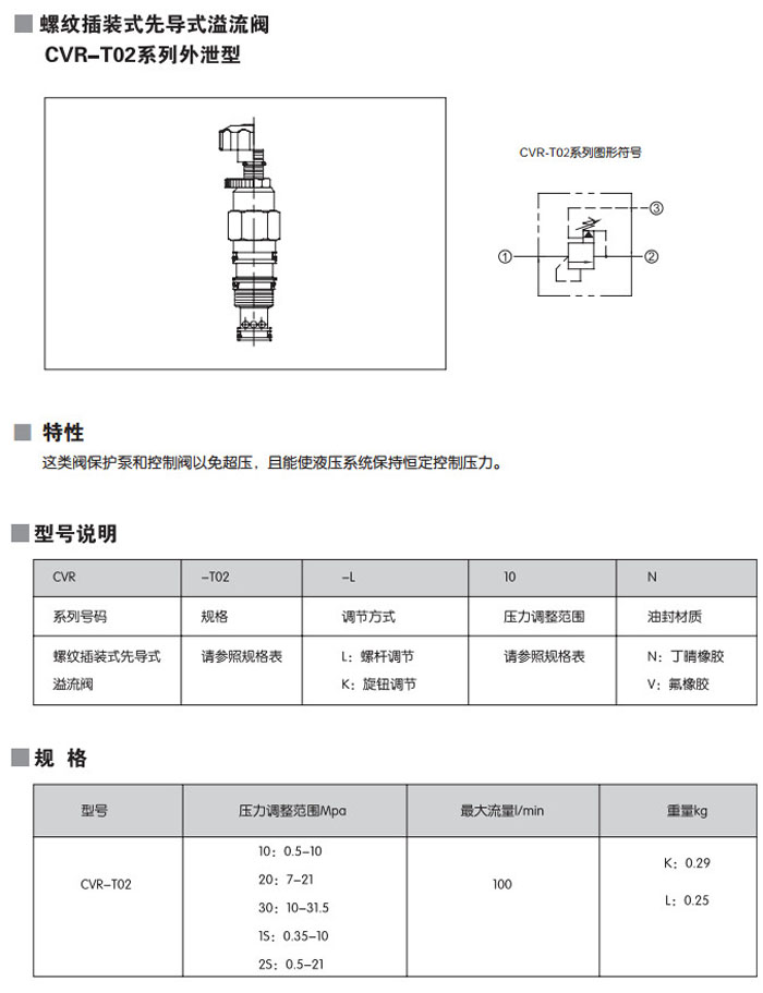 CVR-T02-L10N,CVR-T02-K10N,CVR-T02-L20N,CVR-T02-L30N,CVR-T02-L1SN,CVR-T02-L2SN,螺紋插裝式先導式溢流閥